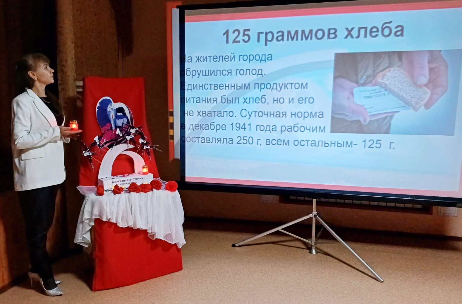 На часе памяти в ДК д. Чемодурово дети познакомились с трагической историей семьи Тани Савичевой и "Дорогой жизни", которая была единственным путём сообщения осаждённого города с Большой землей. Участники мероприятия посмотрели тематический видеоролик "Непокорённые" и ответили на вопросы викторины. В рамках мероприятия прошла акция "Блокадный хлеб", где жителям деревни раздавали кусочки ржаного хлеба весом в 125 граммов: именно такая ежедневная минимальная норма была установлена во время блокады Ленинграда. В завершение ребята изготовили голубей-символов мира и надежды на светлое будущее.