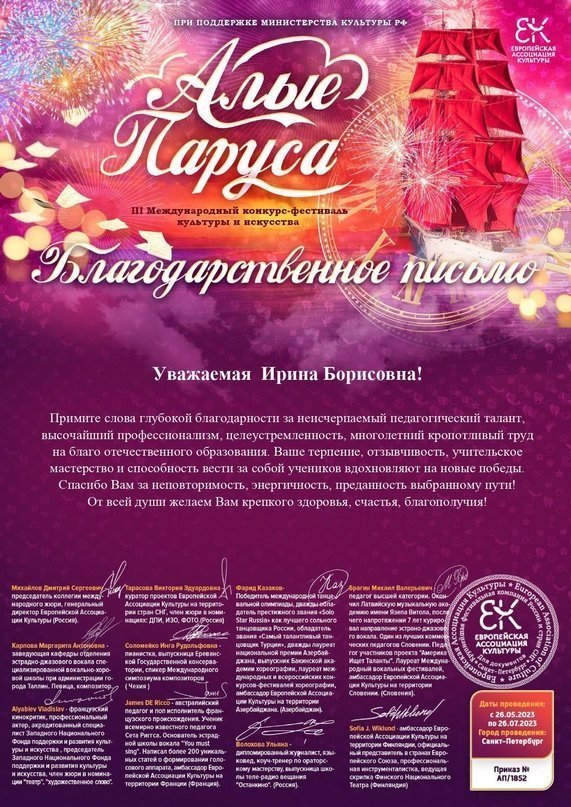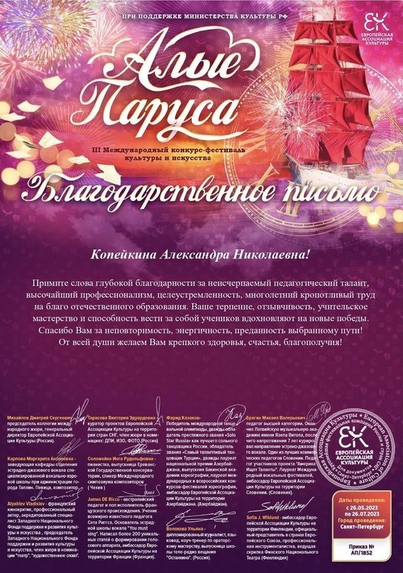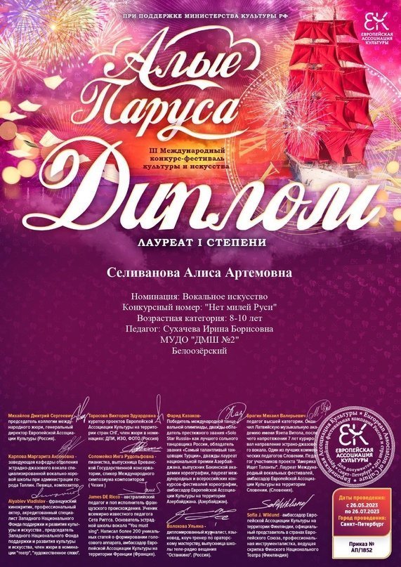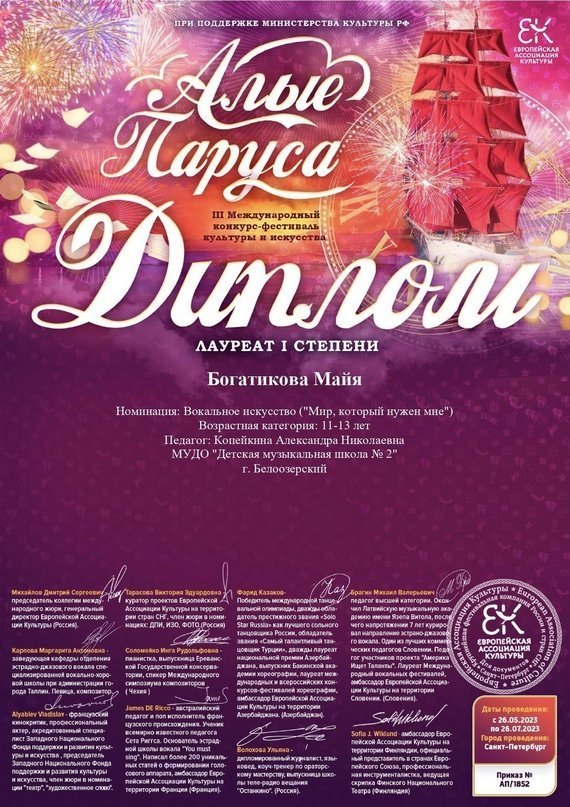 Поздравляем с победой в III Международном конкурсе-фестивале культуры и искусства «АЛЫЕ ПАРУСА - 2023» учащихся вокального отдела Детской музыкальной школы №2.