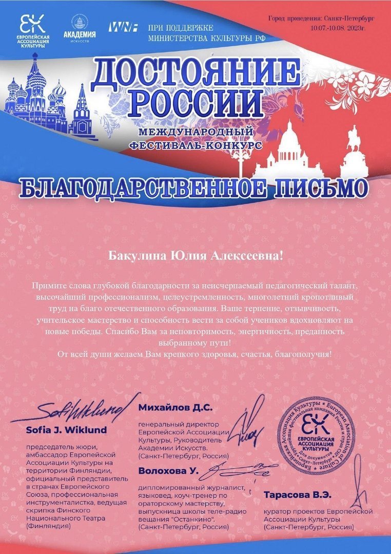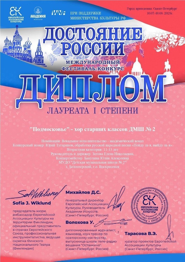 Поздравляем с победой в Международном фестивале - конкурсе «ДОСТОЯНИЕ РОССИИ» вокальный коллектив Детской музыкальной школы №2 Хор "Подмосковье", руководитель и дирижёр Елена Зотова, концертмейстер Юлия Бакулина.