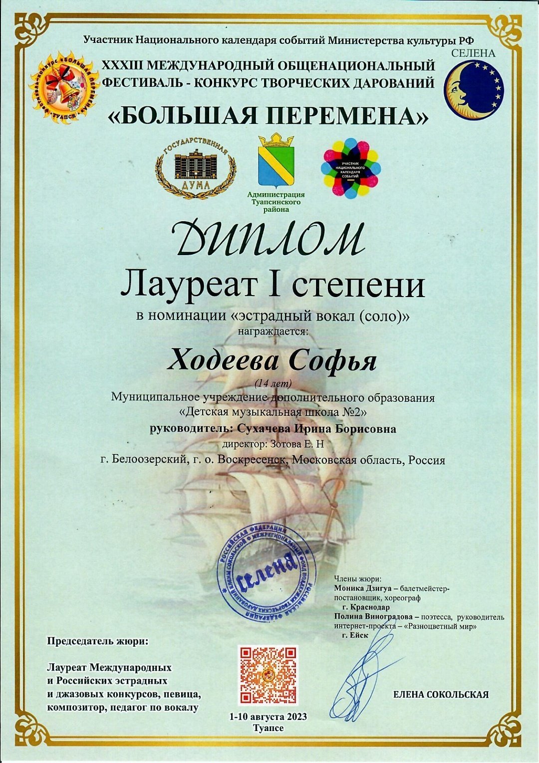 - Софья Ходеева, руководитель Ирина Сухачёва - лауреат I степени;