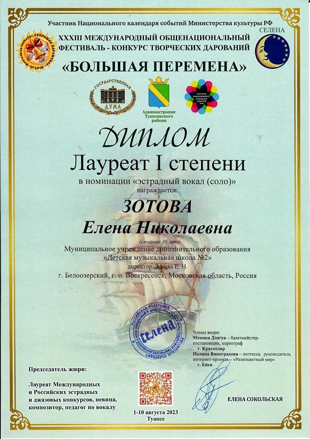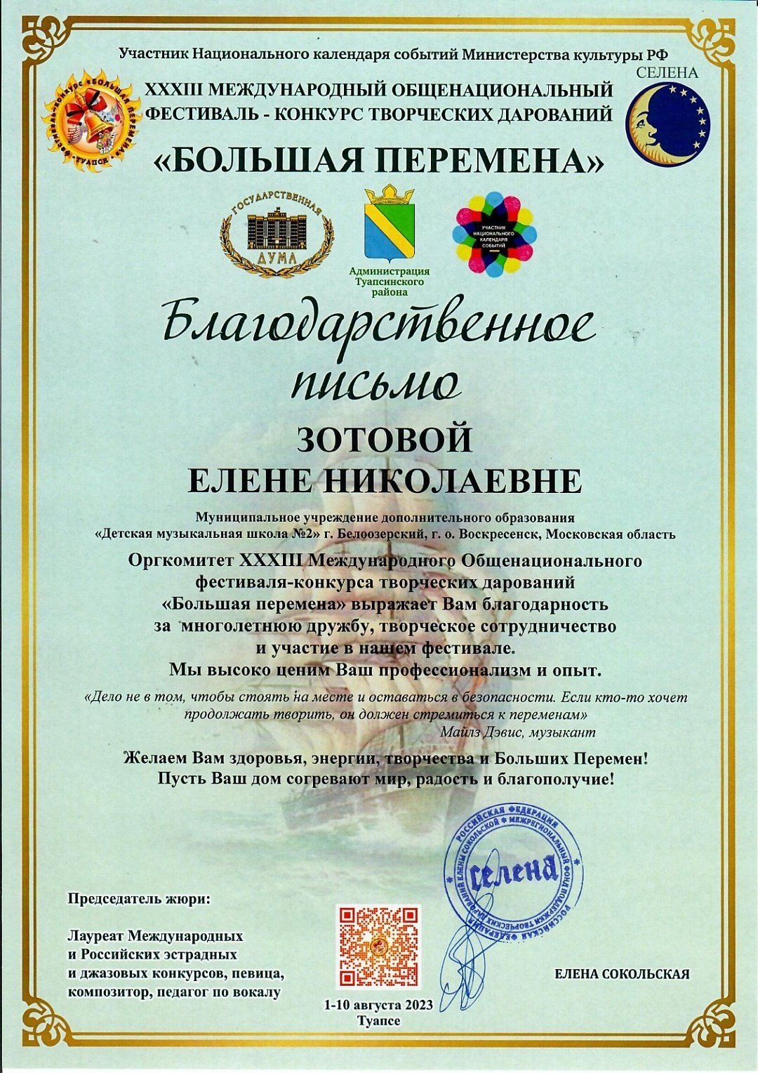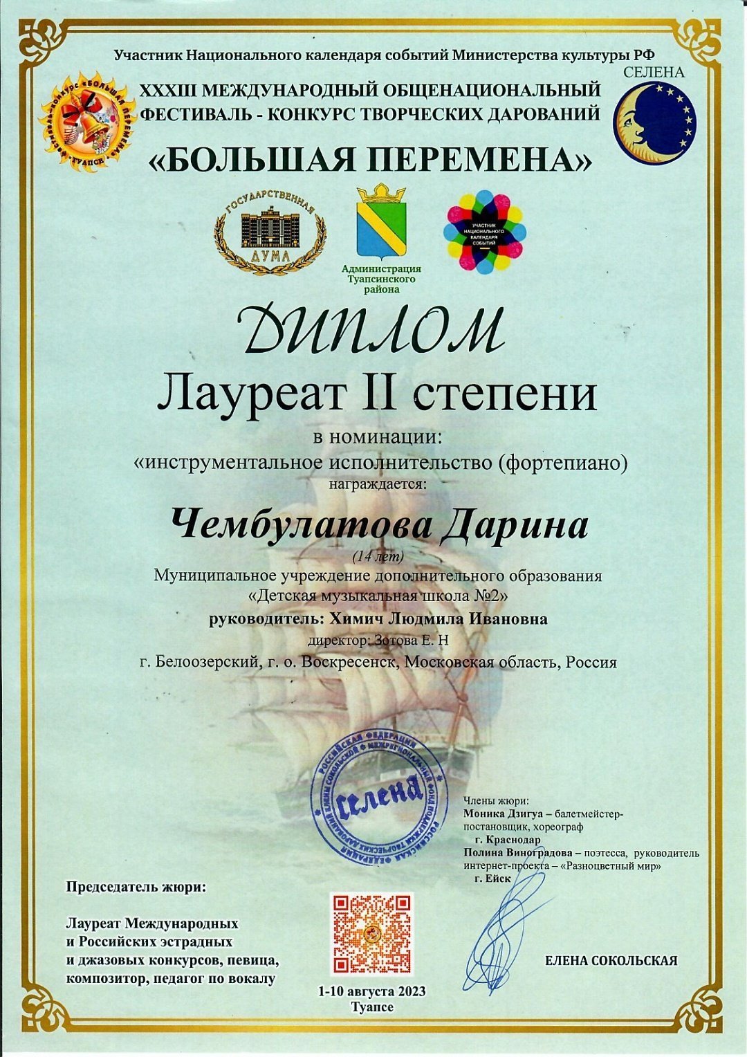 С 1 по 10 августа в г.Туапсе прошел ХХXIII МЕЖДУНАРОДНЫЙ ОБЩЕНАЦИОНАЛЬНЫЙ ФЕСТИВАЛЬ-КОНКУРС ТВОРЧЕСКИХ ДАРОВАНИЙ «БОЛЬШАЯ ПЕРЕМЕНА», в котором приняли участие учащиеся и преподаватели Детской музыкальной школы №2.