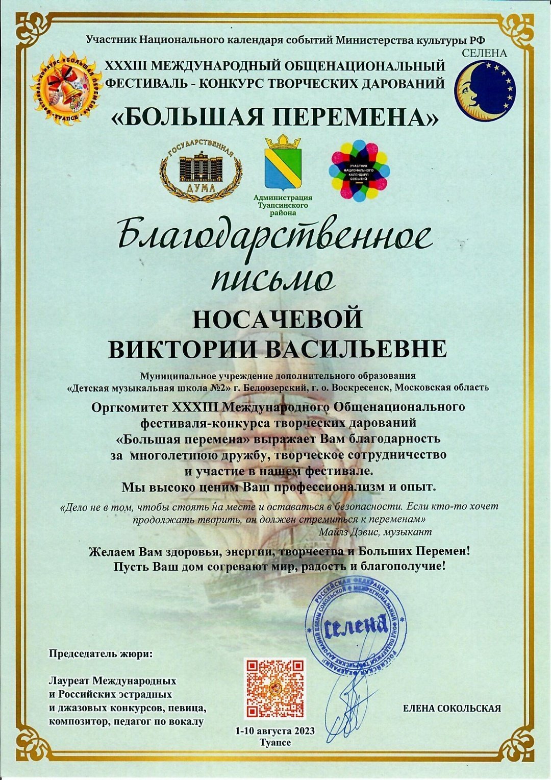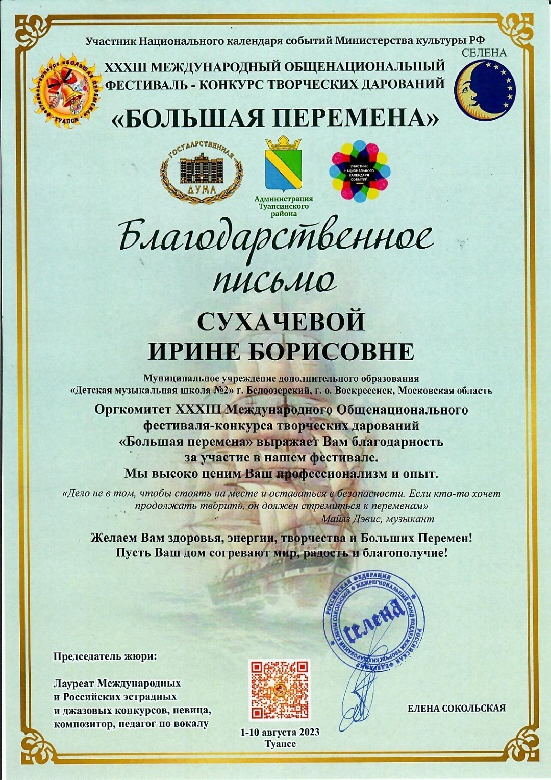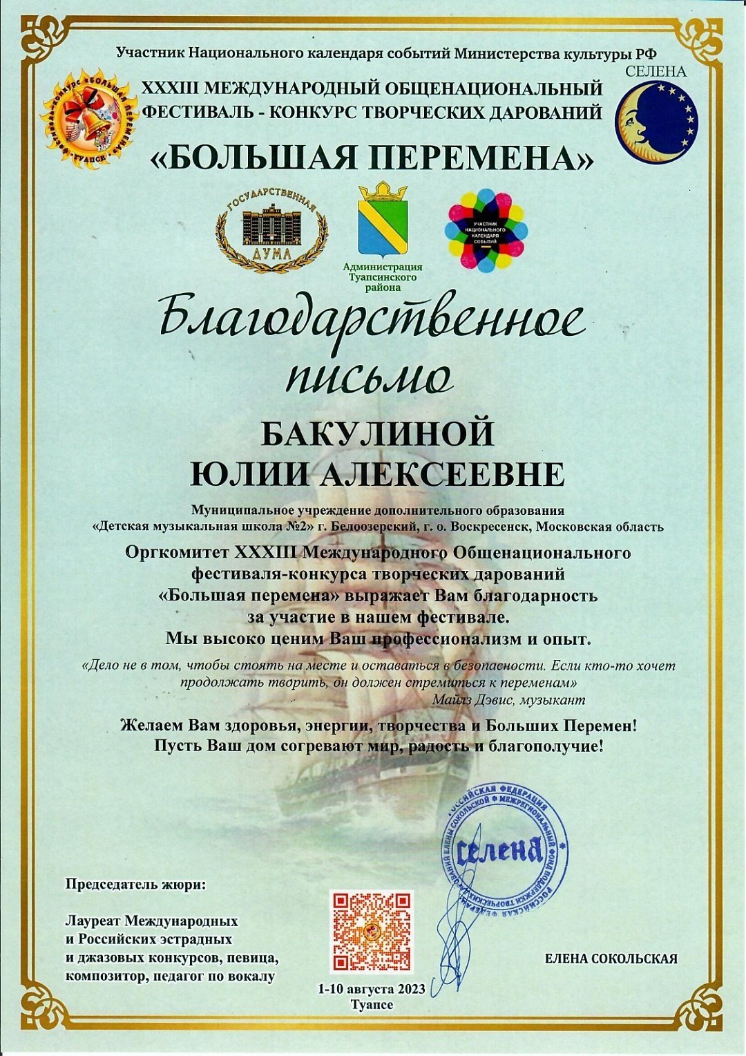 С 1 по 10 августа в г.Туапсе прошел ХХXIII МЕЖДУНАРОДНЫЙ ОБЩЕНАЦИОНАЛЬНЫЙ ФЕСТИВАЛЬ-КОНКУРС ТВОРЧЕСКИХ ДАРОВАНИЙ «БОЛЬШАЯ ПЕРЕМЕНА», в котором приняли участие учащиеся и преподаватели Детской музыкальной школы №2.