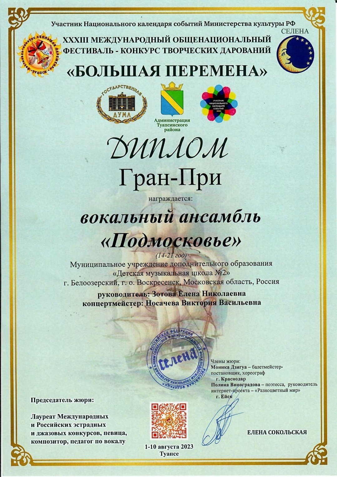 В номинации «Академический вокал» Вокальный ансамбль «Подмосковье», руководитель Елена Зотова, концертмейстер Виктория Носачева, стал обладателем самой высокой награды конкурса - Гран-При.