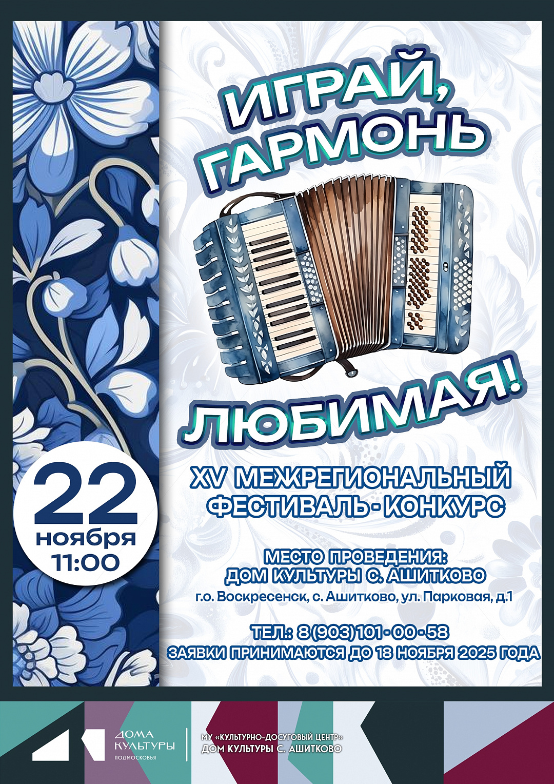 Заявки принимаются до 18 ноября 2025 года включительно на электронный адрес: dkashitkovo@mail.ru с пометкой «Конкурс «Играй, гармонь любимая».